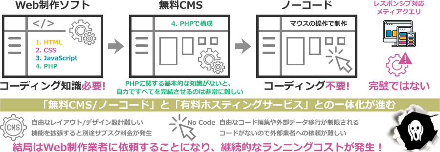 マウス操作のみで制作できる、コーディング不要のノーコード需要も高まっていますが、特定プラットフォームに依存するため、自由なコード編集や外部データ移行に制限があるのが現状です。また、コードが存在しないため外部業者へ依頼しづらい点も考慮する必要があります。さらに近年では、「無料CMS/ノーコード」と「有料ホスティングサービス」の一体化が進み、結果として継続的にランニングコストが発生する仕組みが増えている点にも注意が必要です。