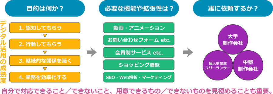 目的地が明確でなければ、最適な手段(ツール)を選ぶことはできません。したがって、まずWebサイト制作の目的を明確にすることが出発点となります。目的が定まれば、依頼先の選定、必要機能の有無、初期費用とランニングコストの概算シミュレーションが可能になります。Webサイトの目的は大きく4つに分類できますが、用途同士が重なる場合もあるため、重要度や優先順位を明確にしておきましょう。Webサイトの見た目や機能が異なっても、「目的」は次の4種類に集約できます。また、1→2→3→4の順に、企業のデジタル活用の成熟度も推し量ることができます。